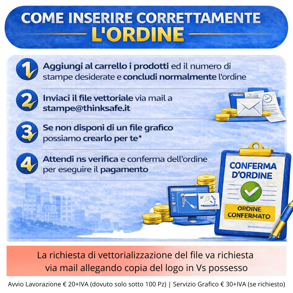 Il file grafico elaborato o adattato per la personalizzazione resta di proprietà esclusiva di Think Safe Italia e viene utilizzato esclusivamente per l’esecuzione delle lavorazioni richieste.