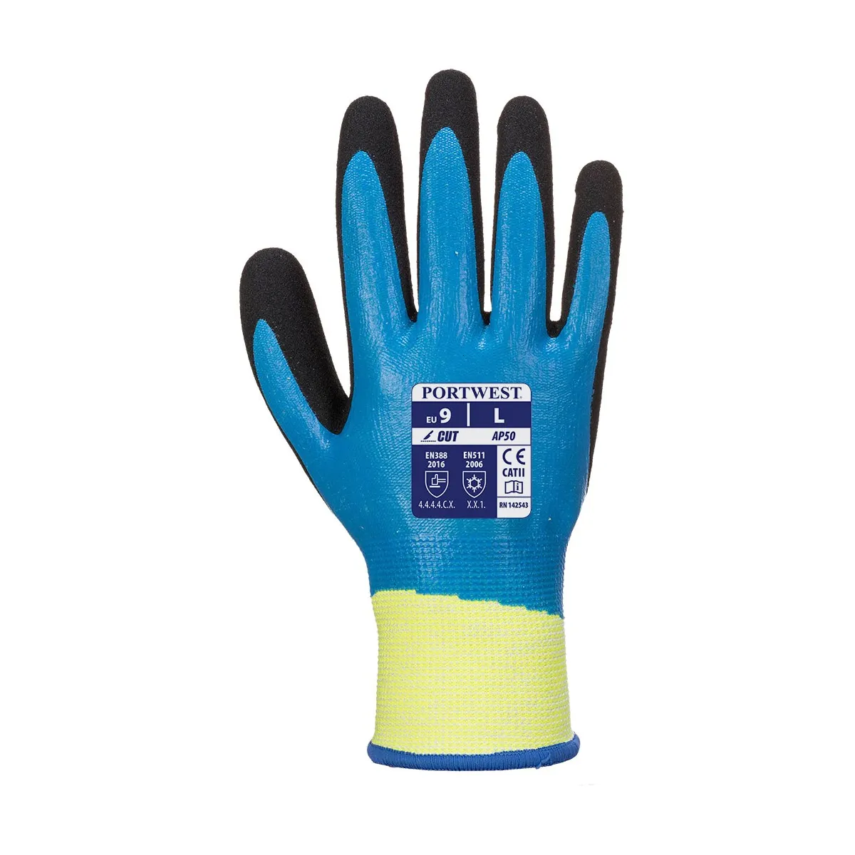 Il guanto Aqua Cut Pro completamente rivestito offre la massima resistenza al taglio. Il primo strato è in nitrile liscio ed il secondo è in schiuma di nitrile, fornendo una presa sicura ed una barriera contro gli agenti contaminanti. Il polsino elastico fornisce una comoda e sicura calzata.
