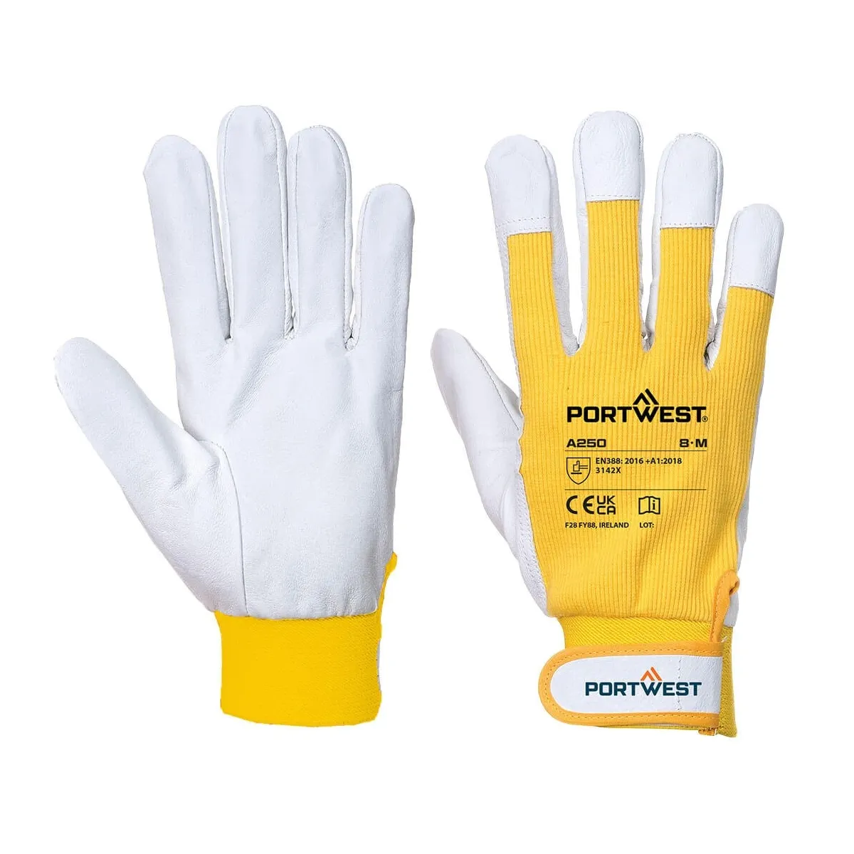 Guanto robusto in pelle di capra con fettuccia a strappo di chiusura, dorso in cotone e dita rinforzate. Adatto all'utilizzo per applicazioni industriali leggere.