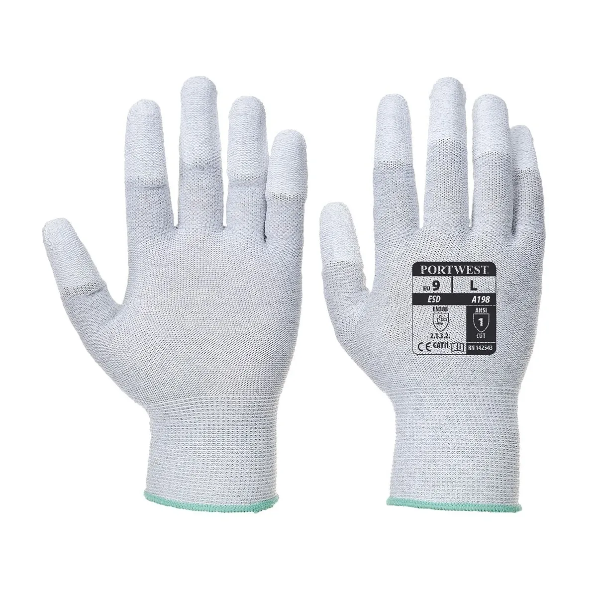 Guanto in maglia 13 G Pylon e guscio in fibra di carbonio che devia l'elettricità statica. Rivestito con palmo in PU durevole per un'eccellente maneggevolezza. Per l'uso in elettronica di montaggio, collaudo e lavori di precisione.