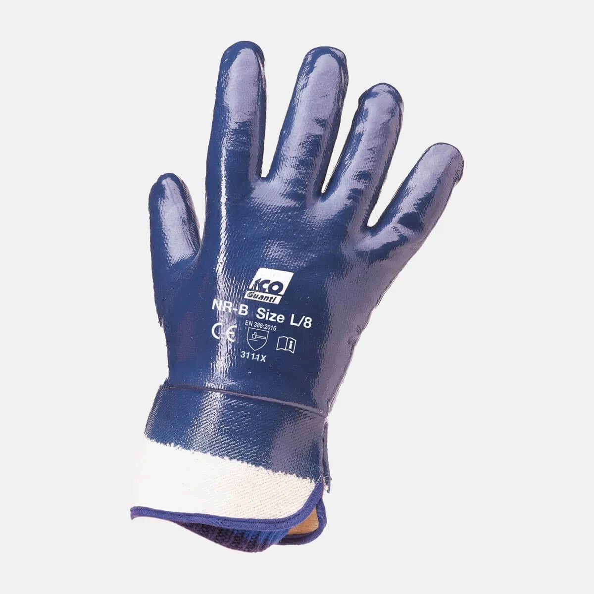 Anatomico (mano destra e sinistra). Rivestimento SINTETICO IN NITRILE ottenuto per immersione completa e manichetta di sicurezza proteggi arterie.