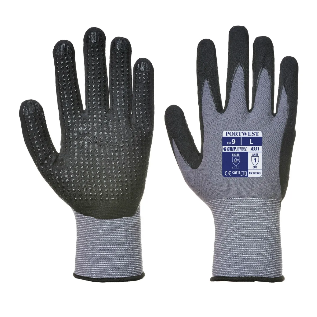 Il guanto antiscivolo puntinato in schiuma di nitrile Dermiflex Plus offre un elevato grip e un eccellente protezione della mano, essendo tra l'altro resistente al taglio (A1). Ha una fodera traspirante senza cuciture che lo rende ideale per lavori di precisione in ambienti asciutti.