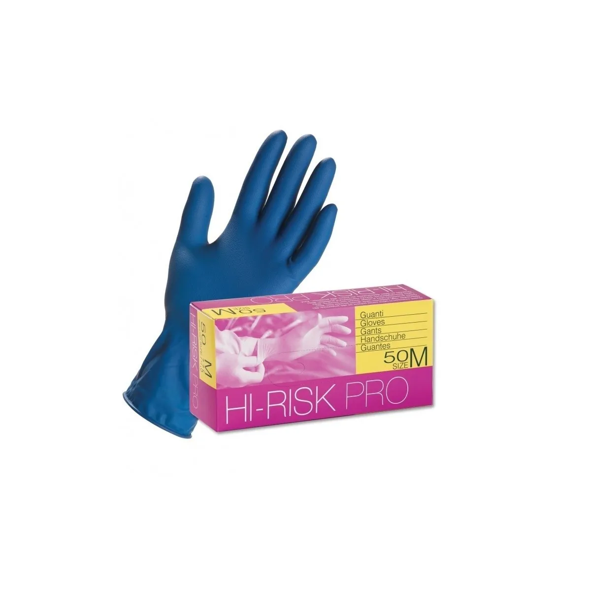 Guanti monouso in LATTICE DI GOMMA NATURALE di colore blue ad alta resistenza sottoposto a processo di clorinazione quindi a ridottissimo contenuto proteico (<50µg/g) e senza polvere lubrificante.