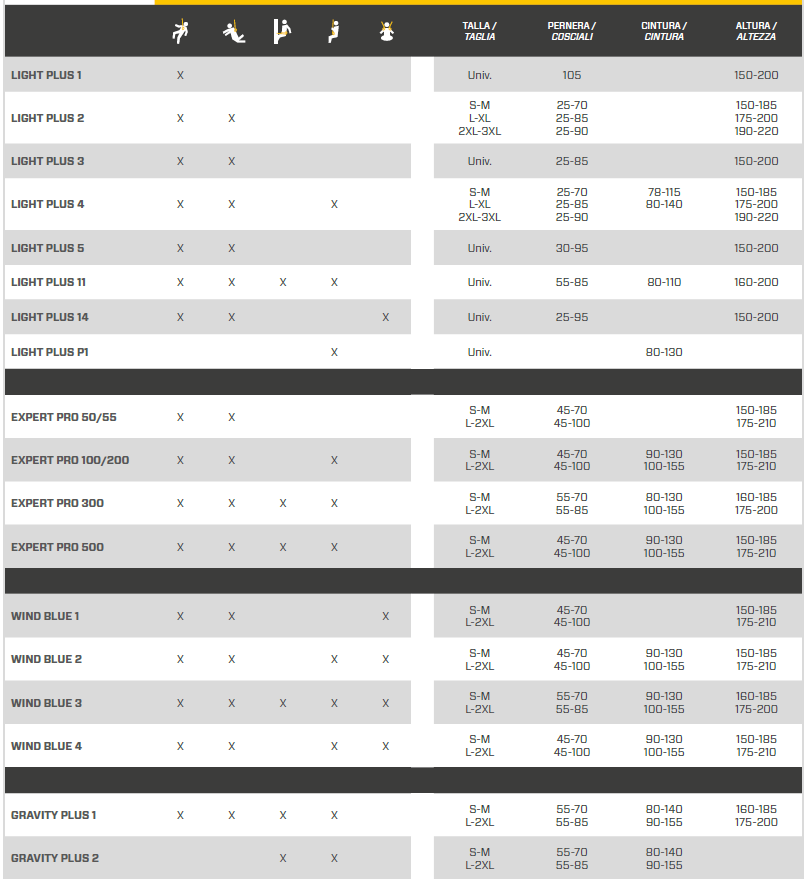 | Taglia | Cosciali | Cintura | Altezza | Peso |