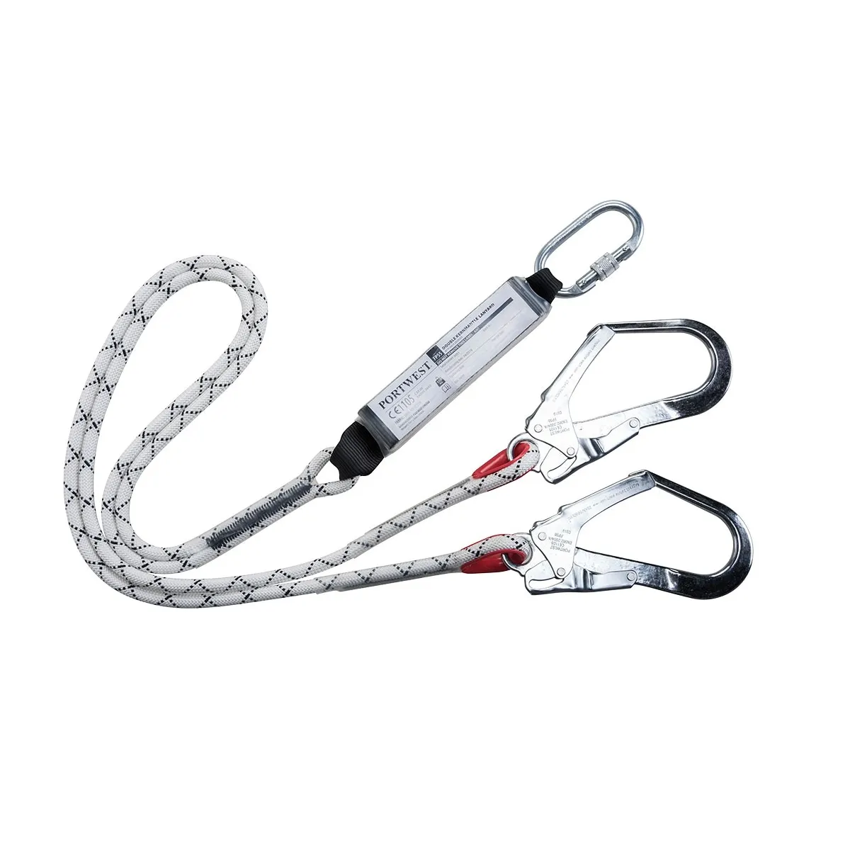 Questo cordino doppio è dotato di un assorbitore di energia e due ganci per ponteggi oltre al moschettone per il collegamento con l'imbracatura. Lunghezza totale 180 cm compresi i connettori