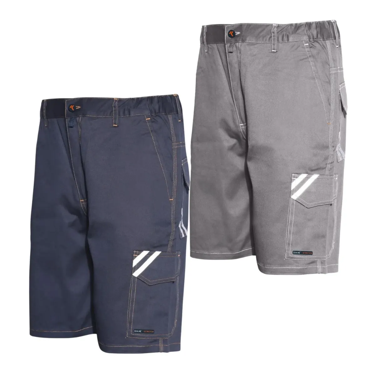 Bermuda da Lavoro Issa Line Strech Start, In tessuto stretch con inserti retroriflettenti, dotato di due tasche frontali, due posteriori coperte da pattina, una tascone laterale con soffietti ed una tasca porta metro. Elastico in vita.