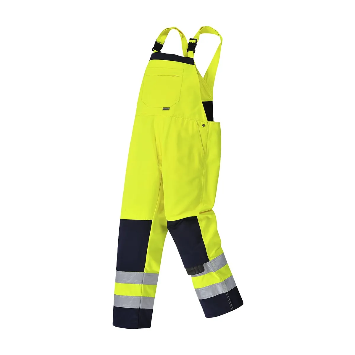 Salopette con una grande tasca sul petto con zip, tasche per ginocchiere e una doppia tasca porta metro, realizzata in tessuto resistente Hi-Vis Kingsmill alta visibilità e offre una fantastica libertà di movimento e la massima versatilità.
