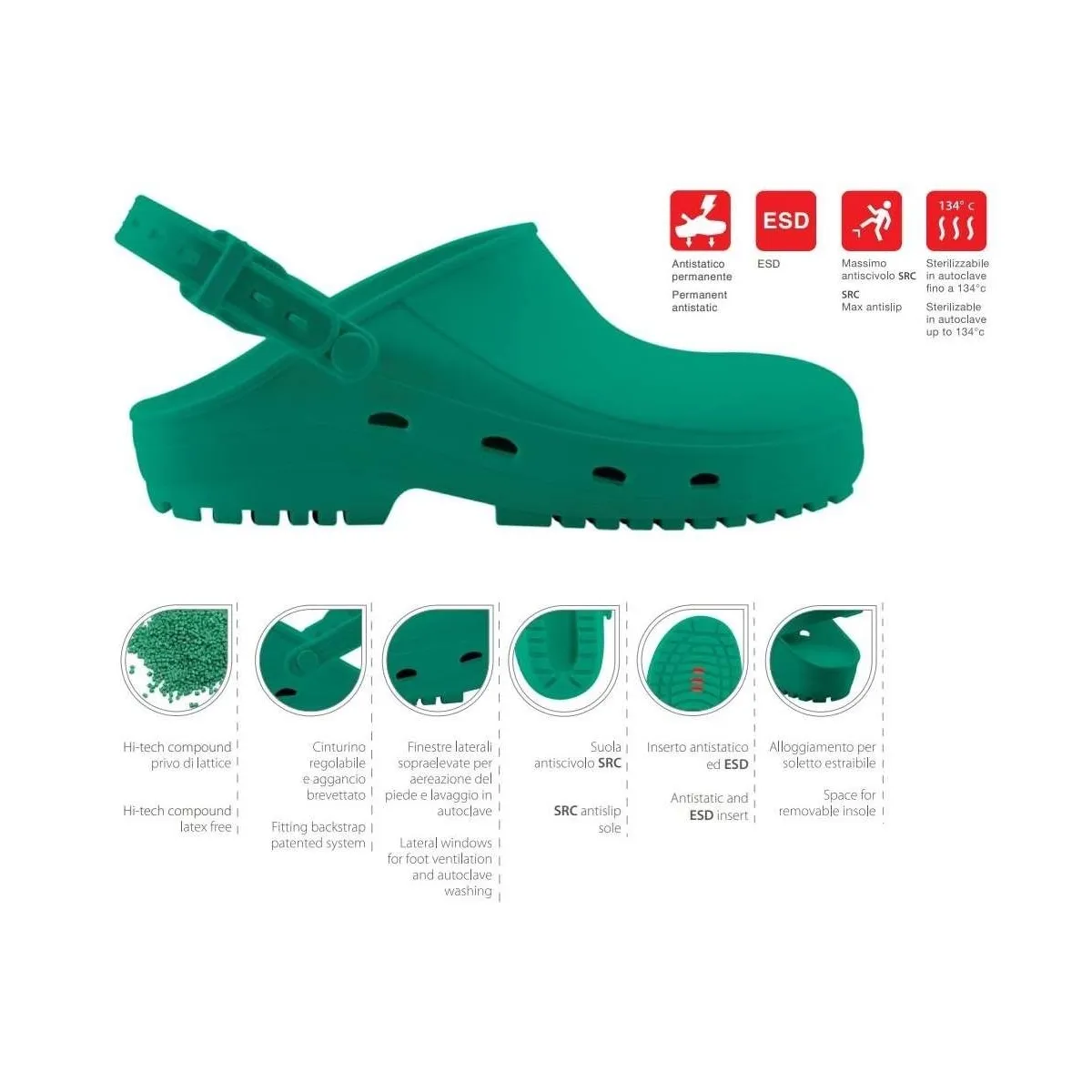 Assorbimento di energia nella parte del tallone, plantare anatomico e laccetto ribaltabile di sicurezza.